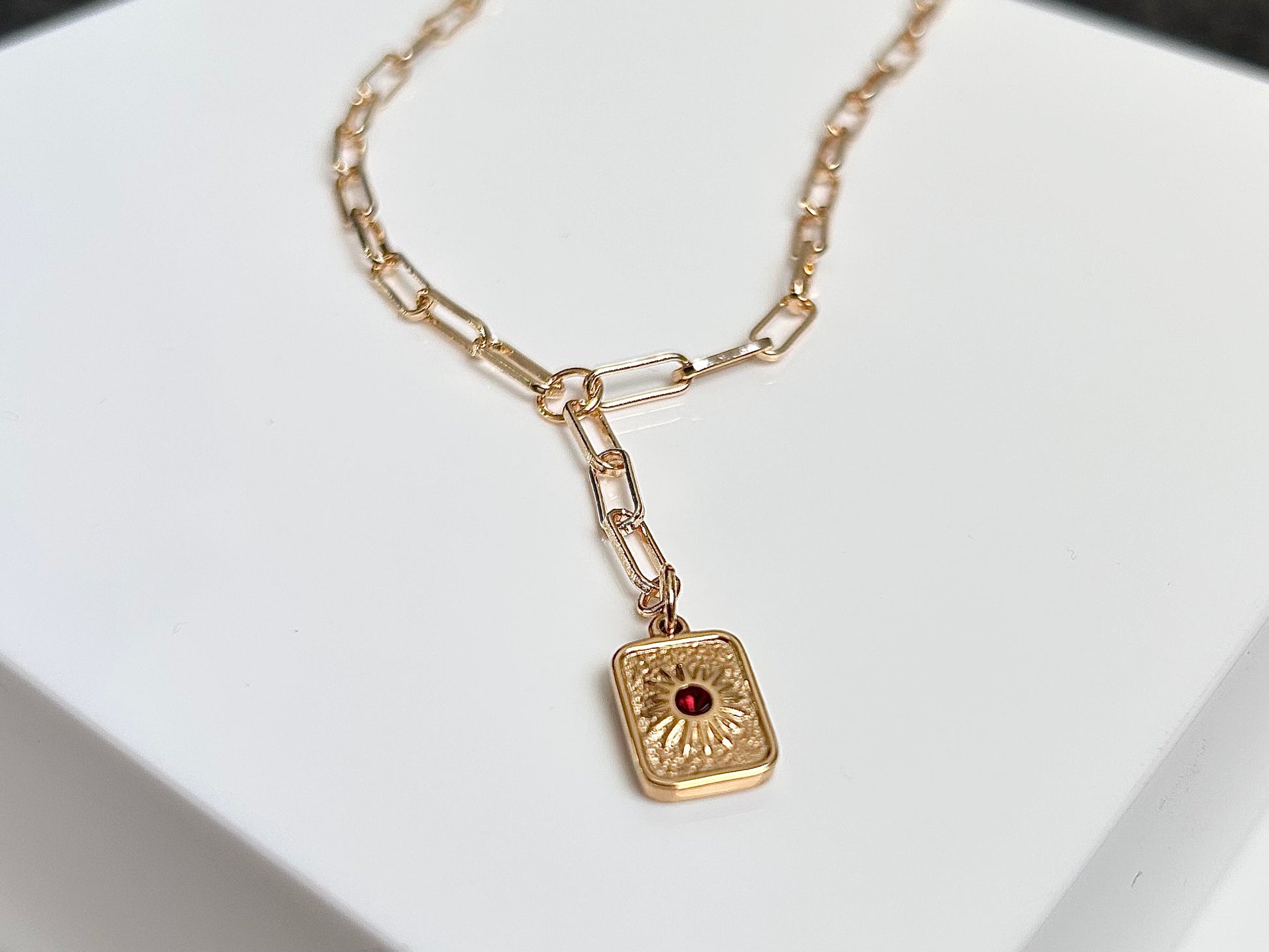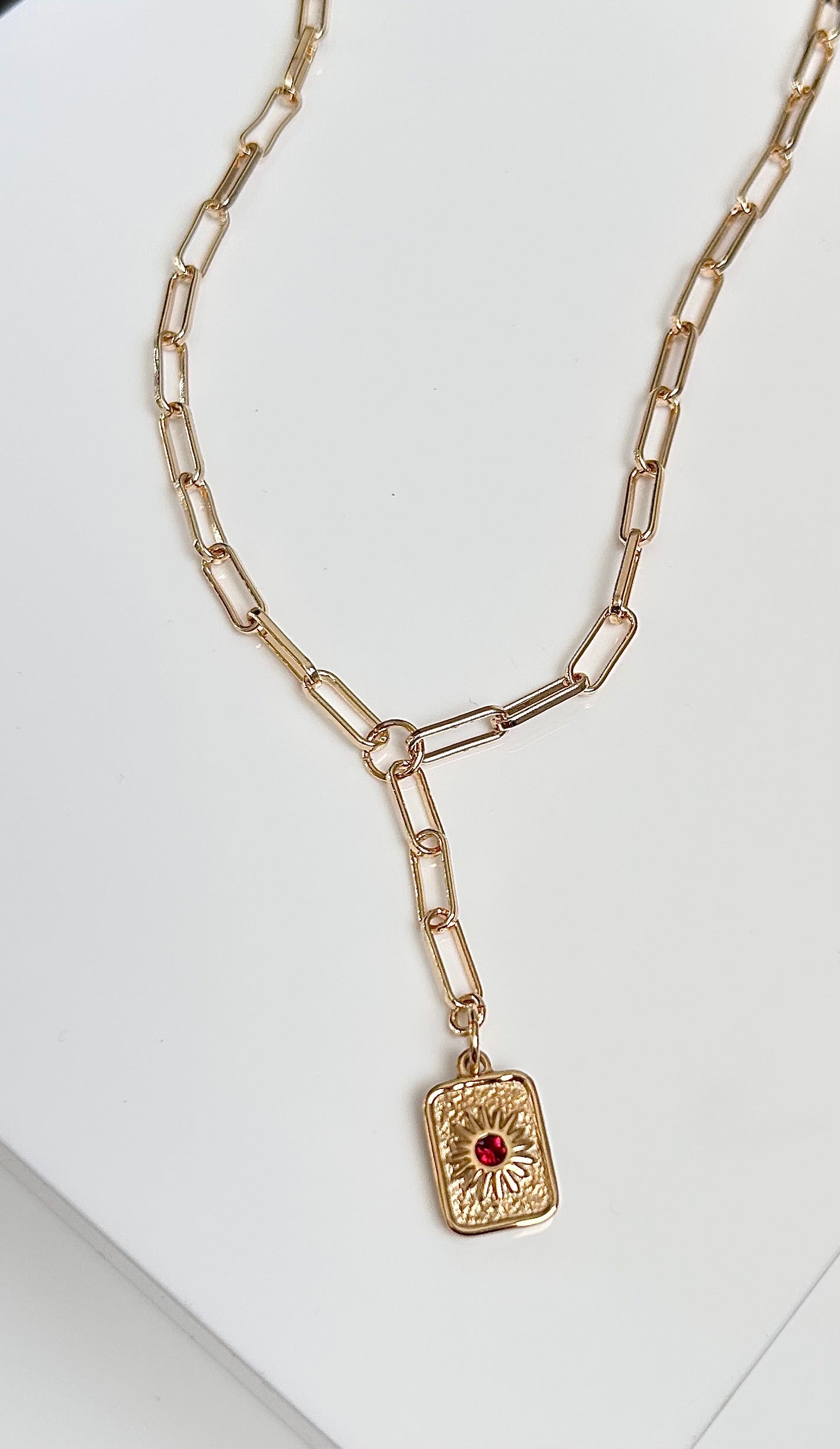 Discover the beauty of Alba, the stunning paperclip drop necklace that will add a touch of elegance and sophistication to any outfit. Featuring a vibrant red stone sun pendant, this necklace will make you stand out and feel confident. Let Alba be your go-to accessory for any occasion.