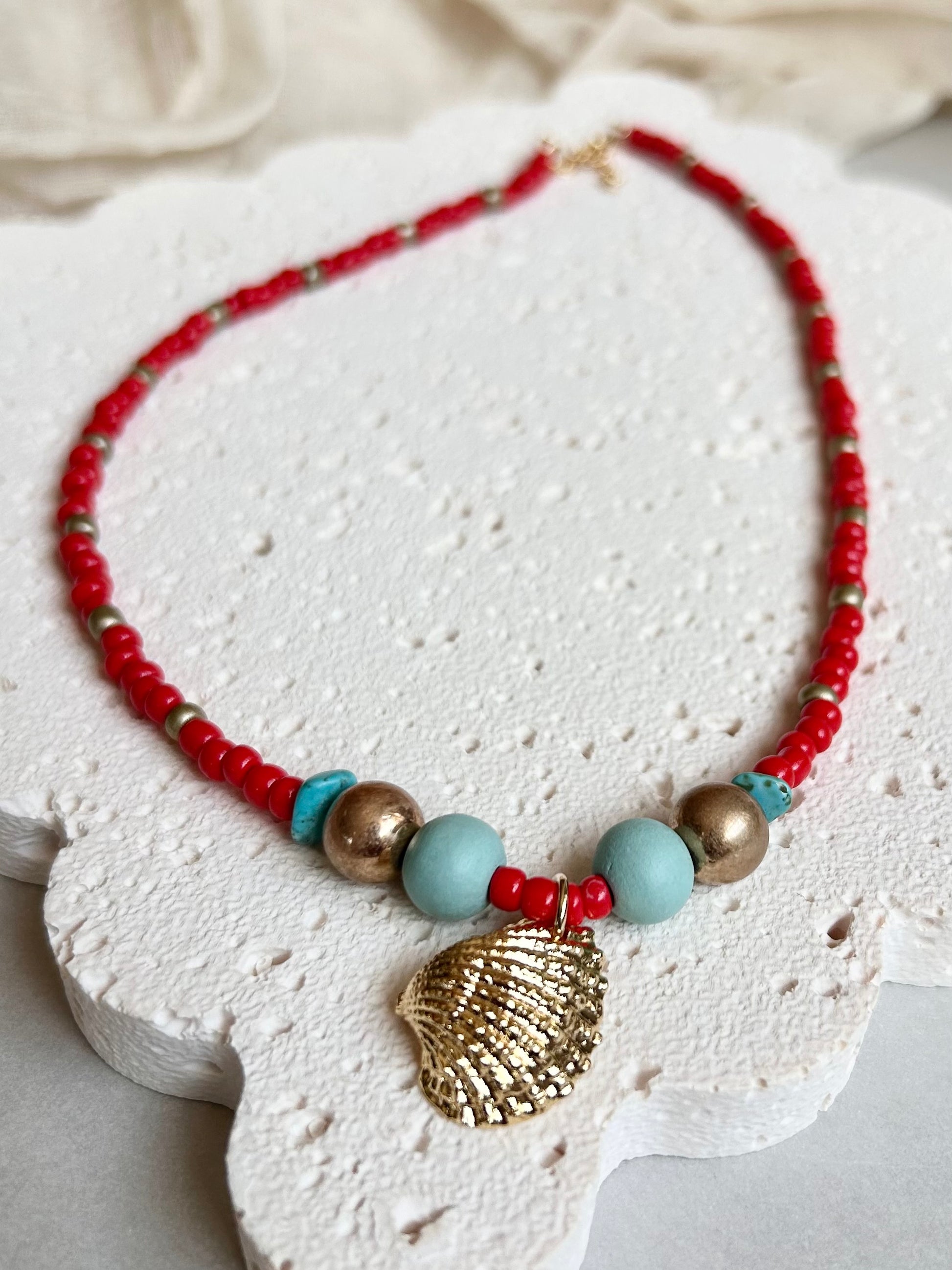 Dive into the sea of style with the Cherie hand beaded necklace! This red and gold statement piece adds a splash of beachy vibes to any outfit. Made with an assortment of natural stone, beads and gold plated charm.