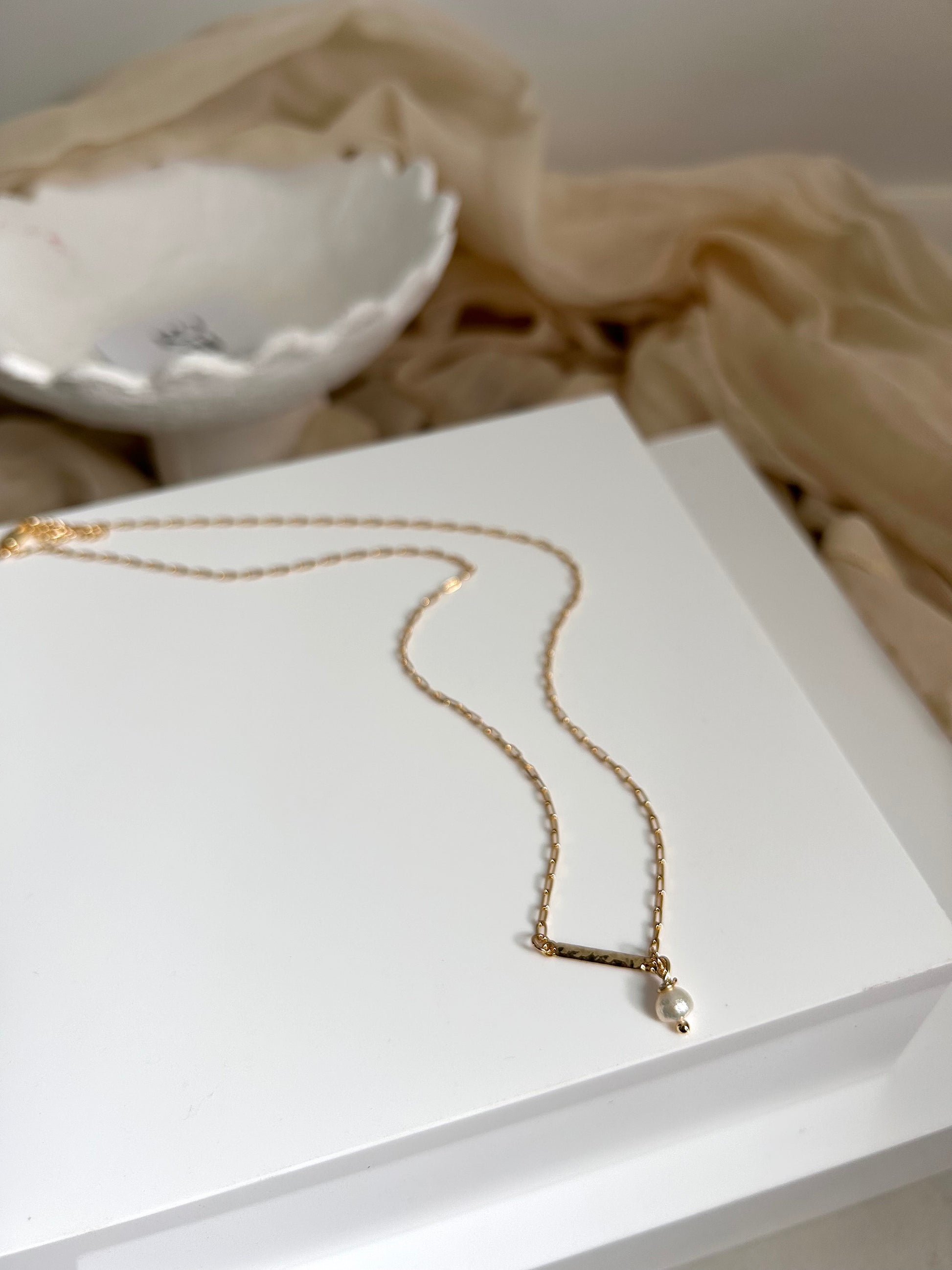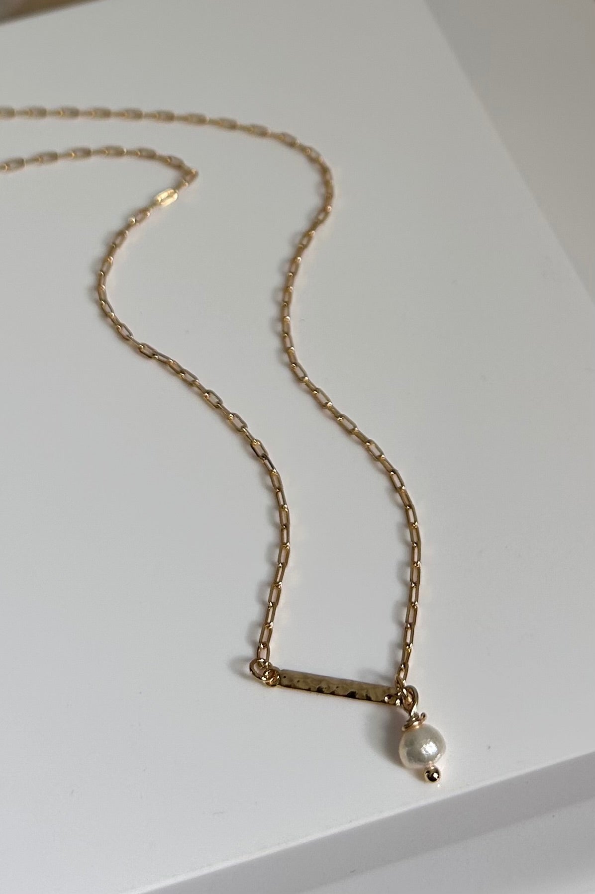 Add a touch of elegance to your look with Emily. This gold plated necklace features a hammered plate and a delicate freshwater pearl charm, perfect for any occasion. Elevate your style and embrace the beauty of simplicity with Emily.