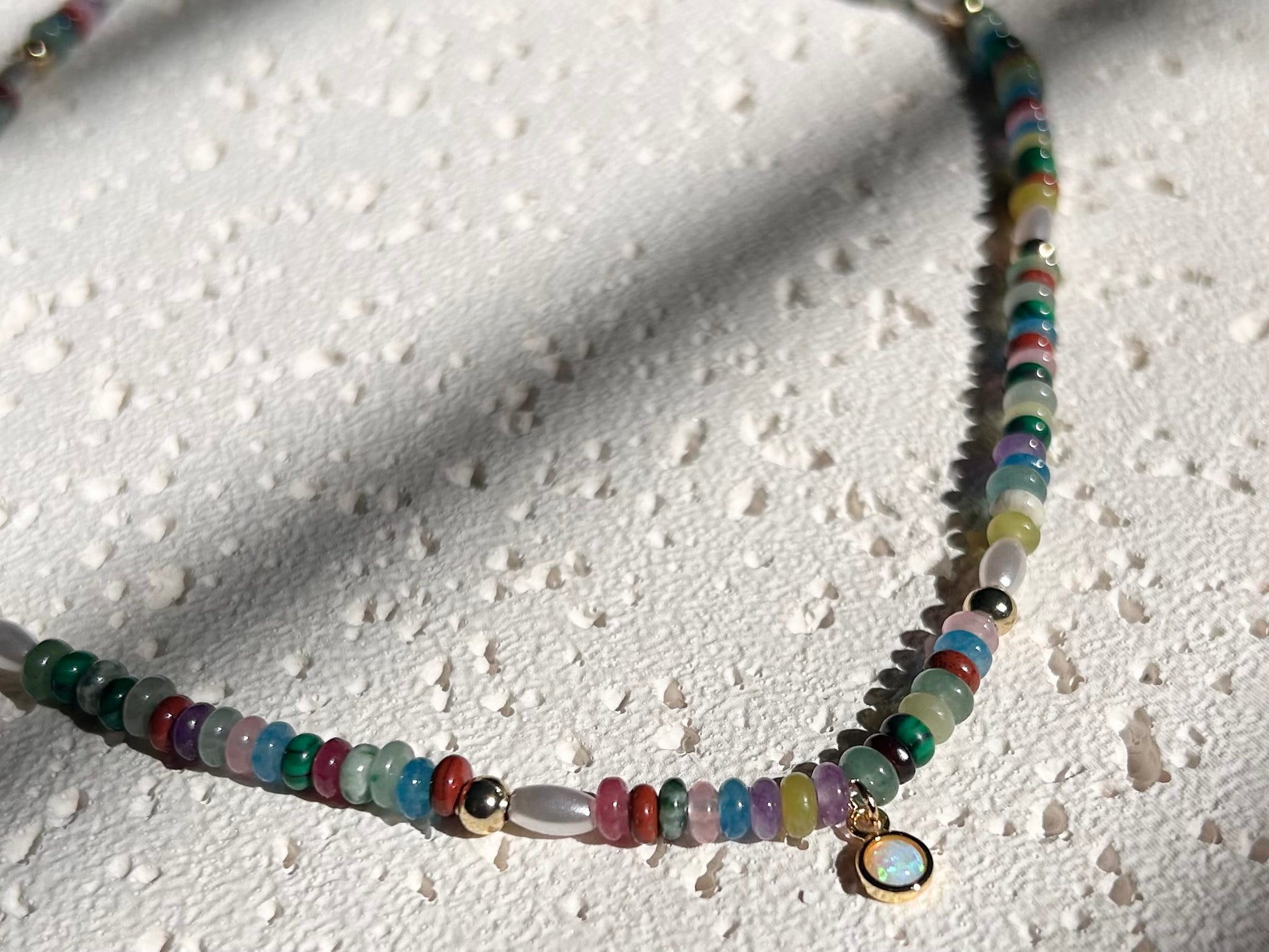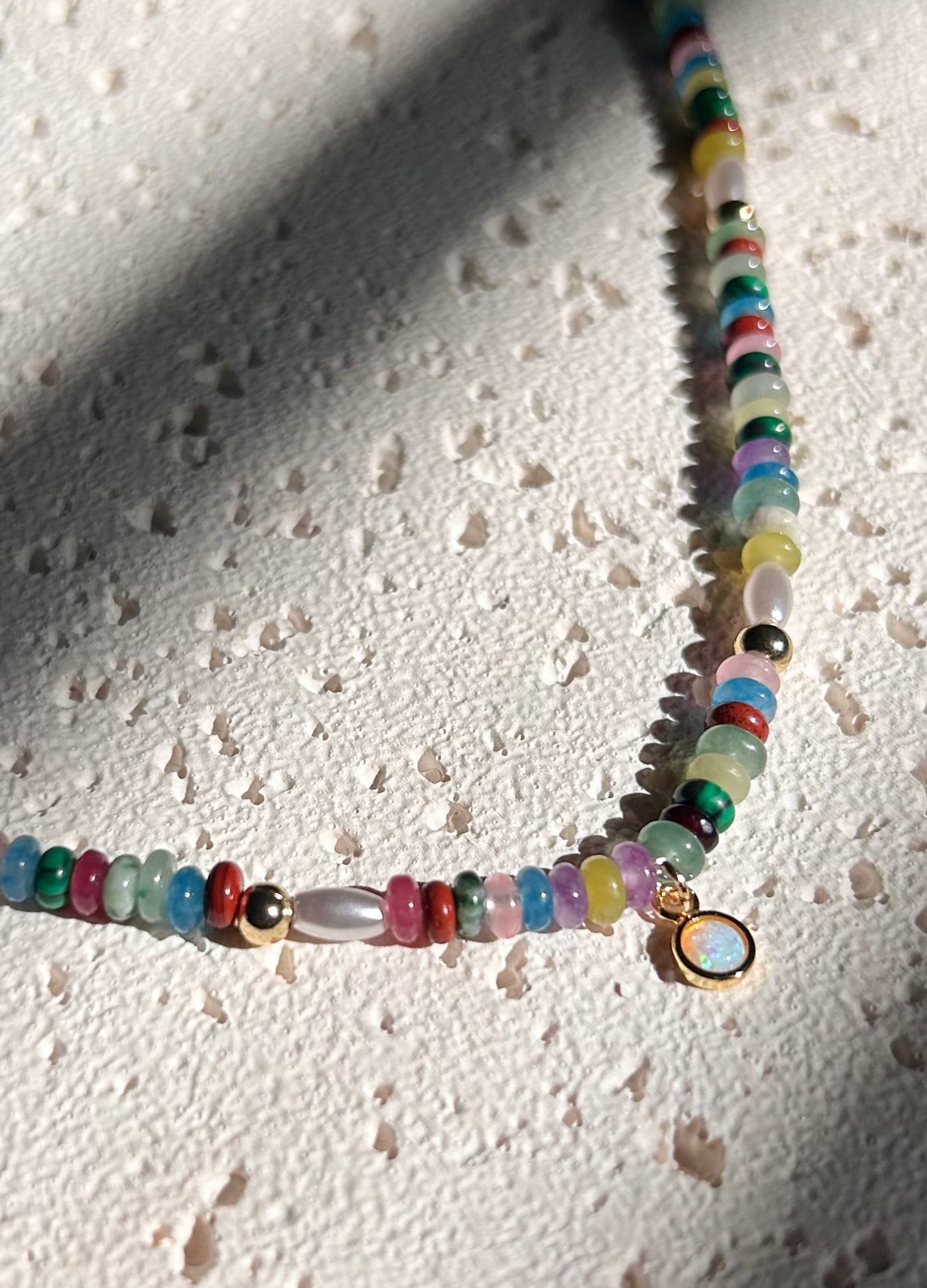 Izzy is a beautifully hand-crafted necklace adorned with multi-colored beads and a delicate opal pendant. Each bead is meticulously hand-beaded, creating a unique and eye-catching piece. The small opal pendant adds a touch of elegance and versatility to this statement necklace. Own a one-of-a-kind accessory with Izzy.