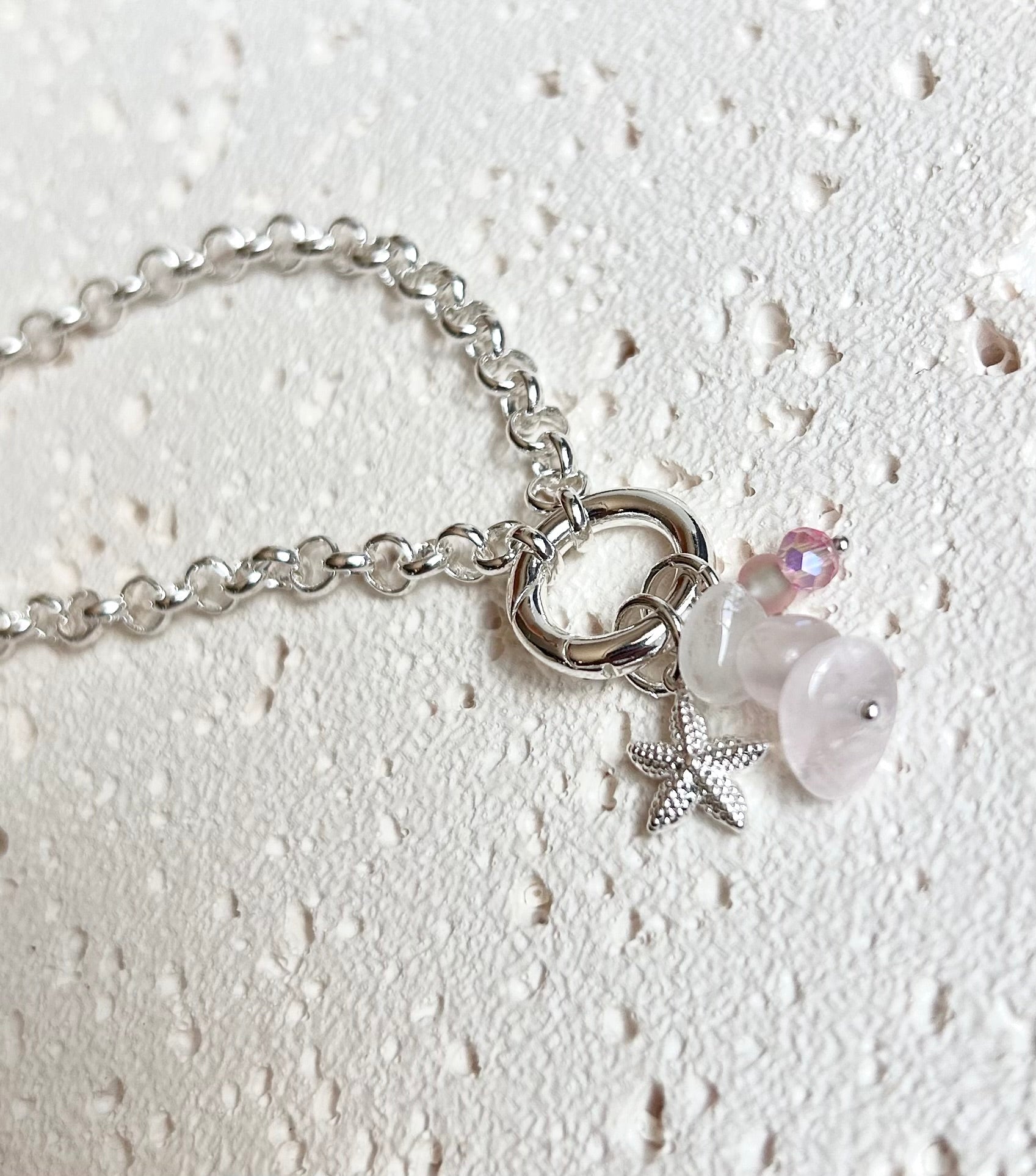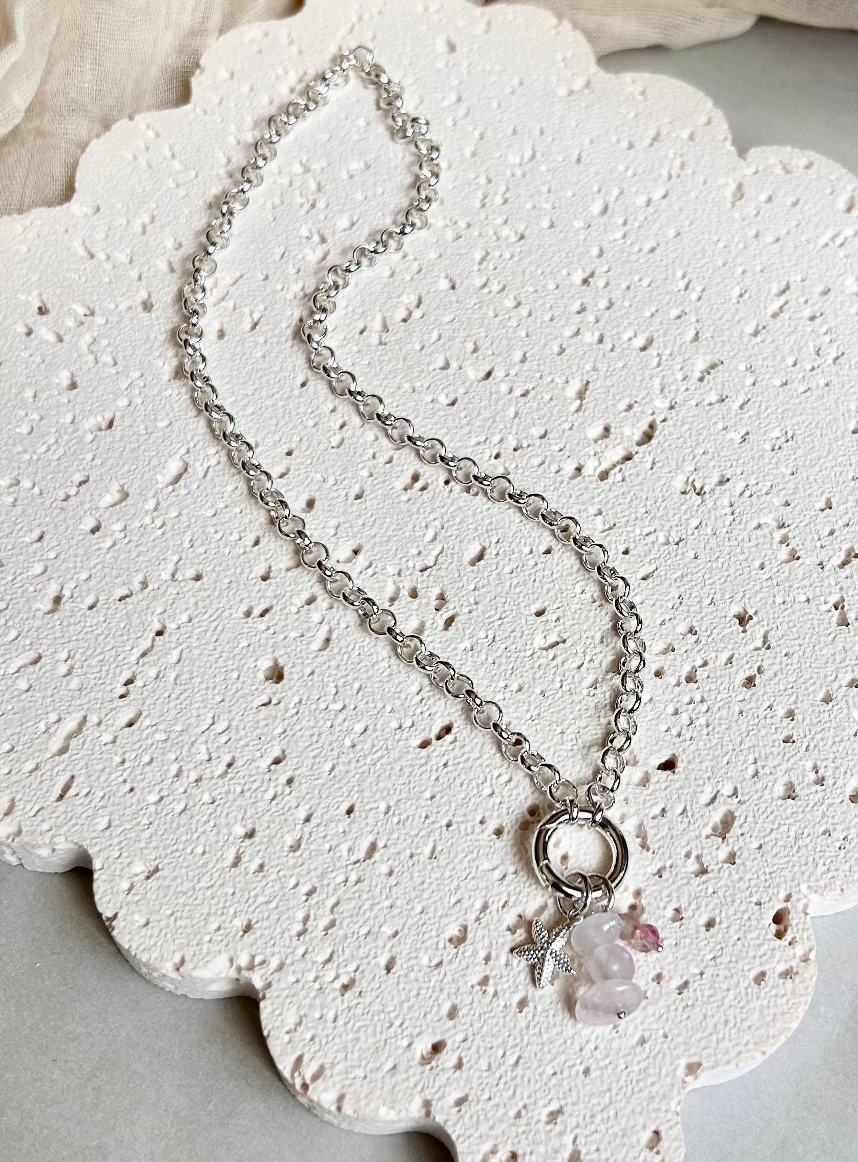 Dare to stand out with the Kim necklace! Adorned with a stunning rose quartz beaded charm and playful starfish, this silver-plated piece elevates your everyday style. Match me with the Kimmy bracelet!