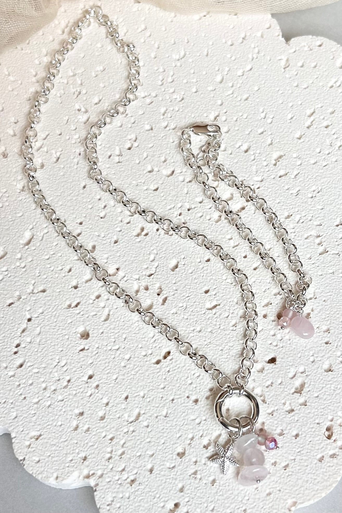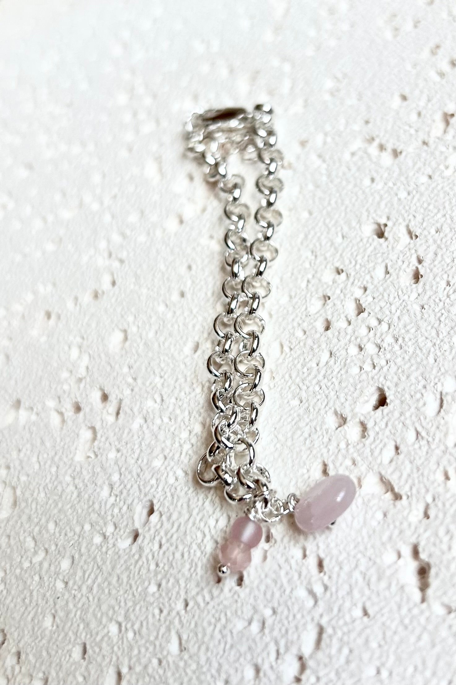 Elevate your style with the Kimmy bracelet! This stunning piece features beautiful rose quartz beaded charm elegantly paired with a silver plated chain. It beautifully complements the Kim necklace, creating a look that radiates love and positivity.