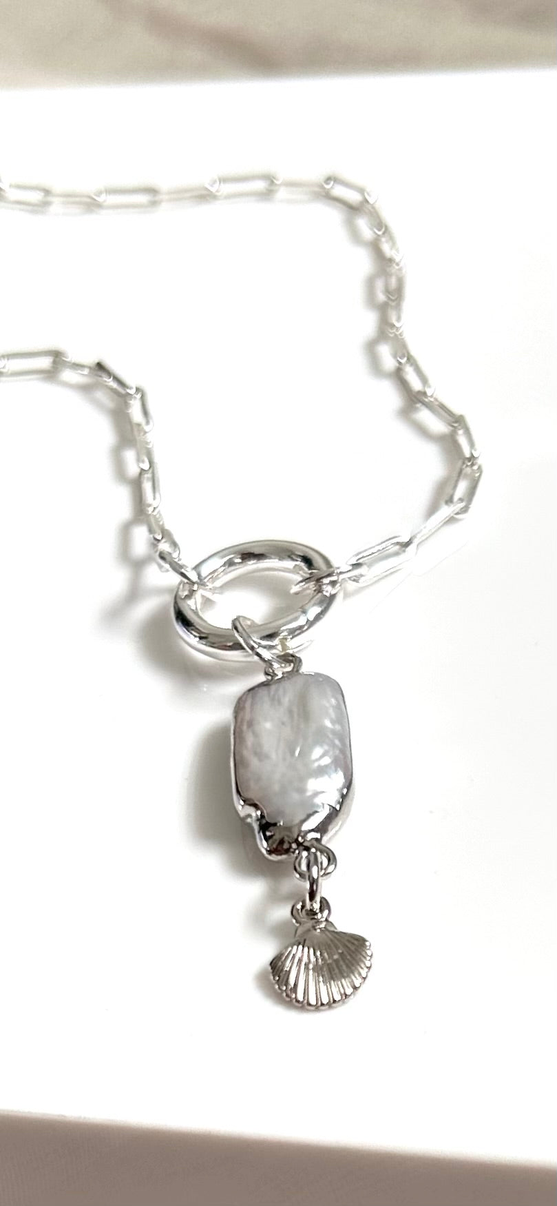 Introducing Marina, the perfect necklace for any occasion. This necklace features a stunning mother of pearl connector and a delicate shell charm. Elevate your style with Marina's exquisite design and add a touch of elegance to any outfit.