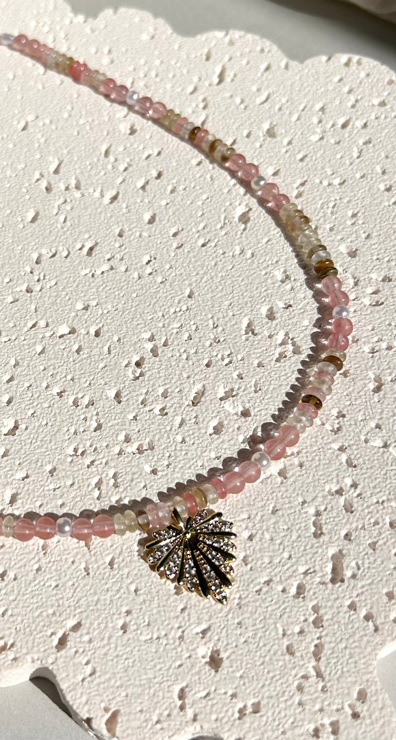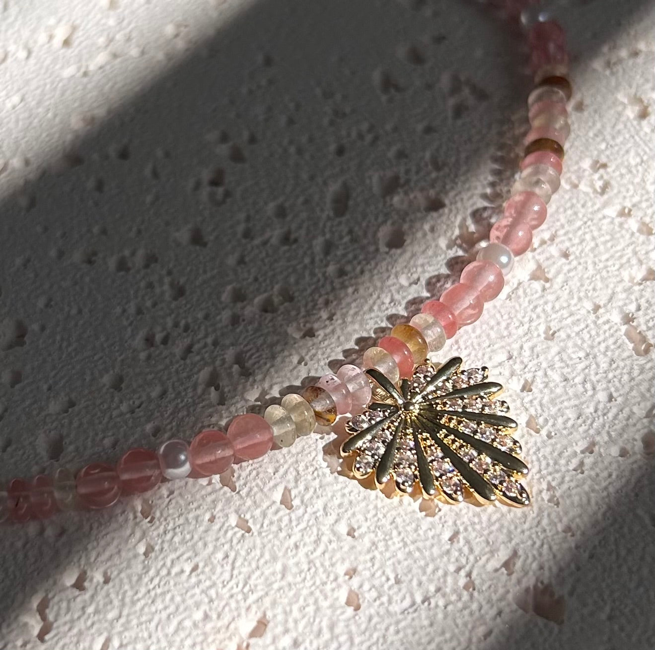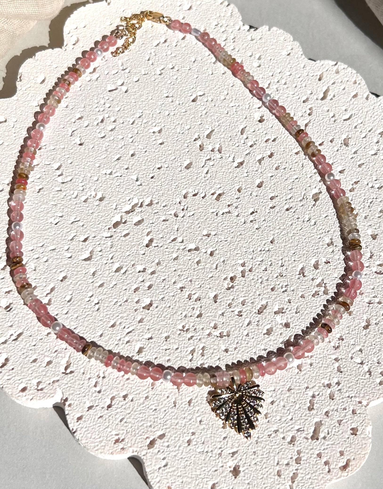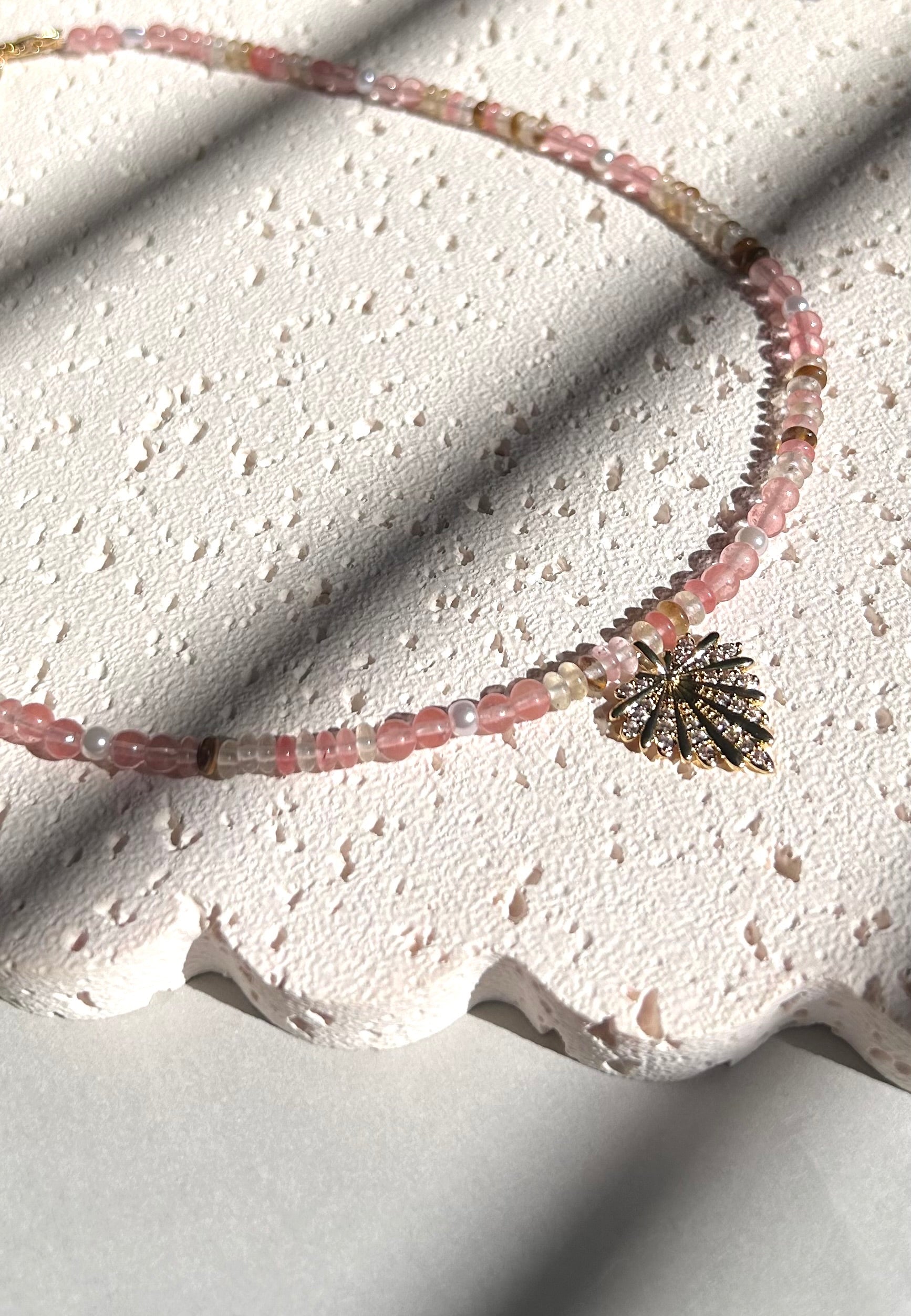 Stacey is a stunning necklace handcrafted with natural stones and a large heart pendant adorned with cubic zirconia. With intricate beadwork and a touch of sparkle, this piece is both elegant and eye-catching.
