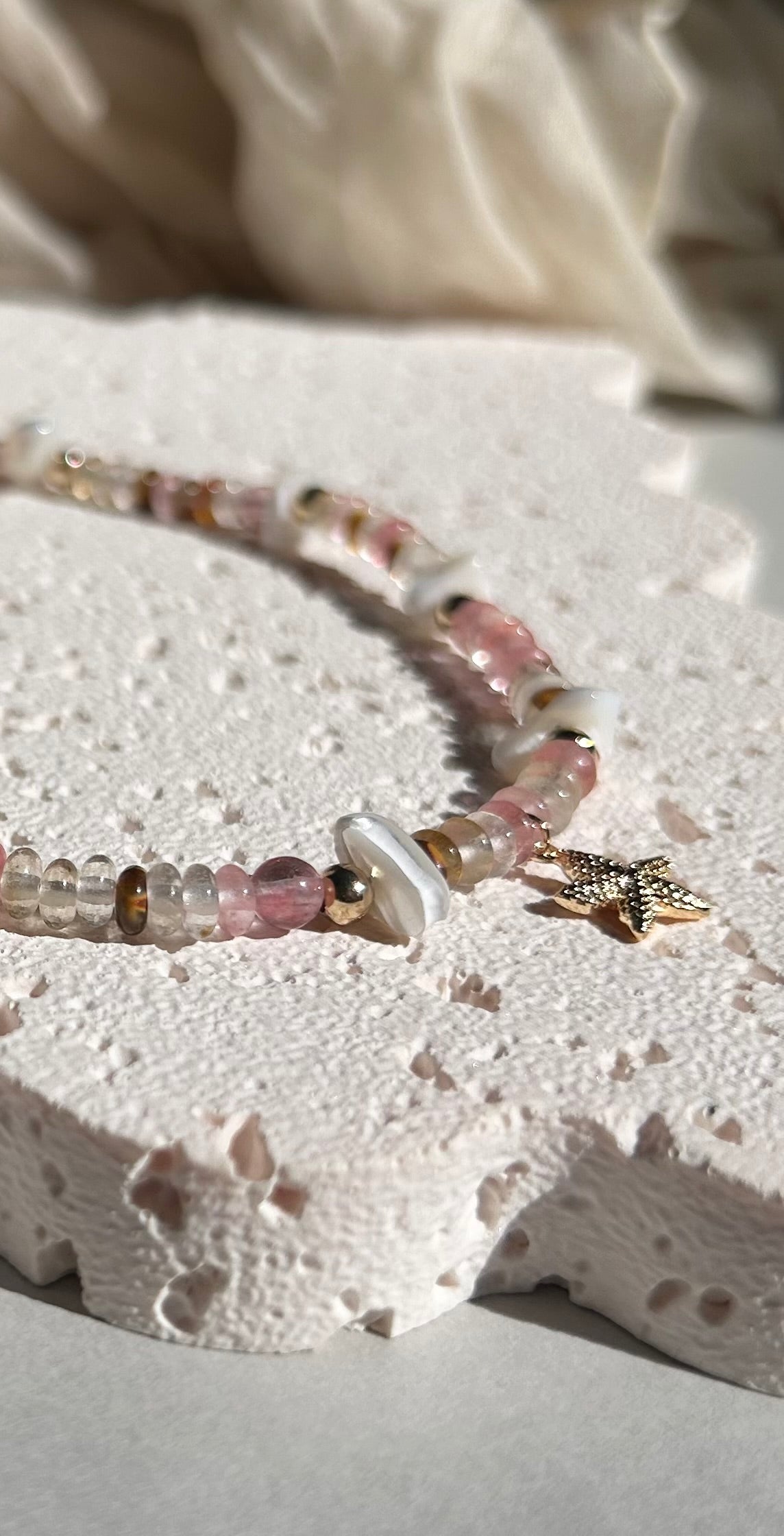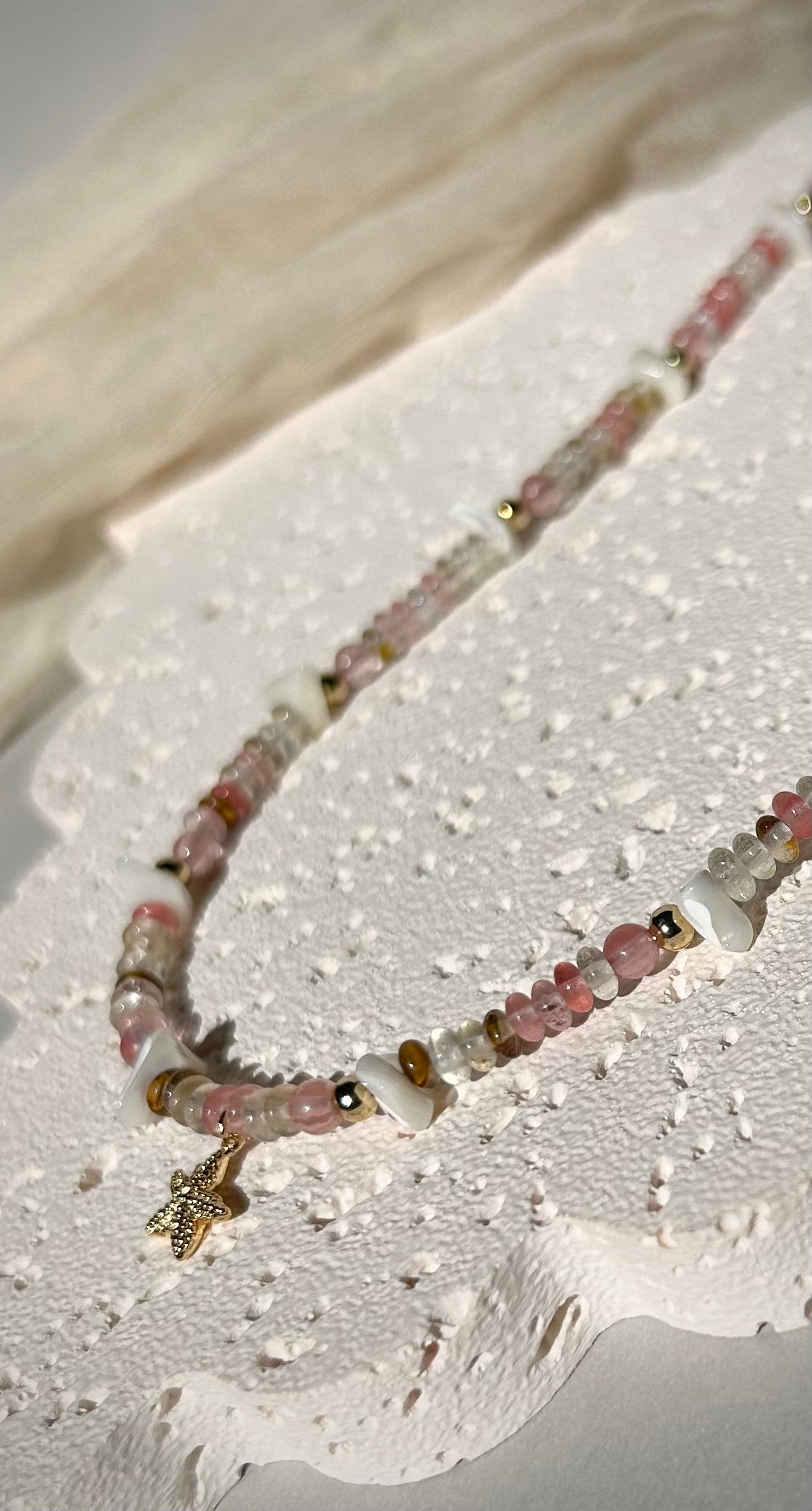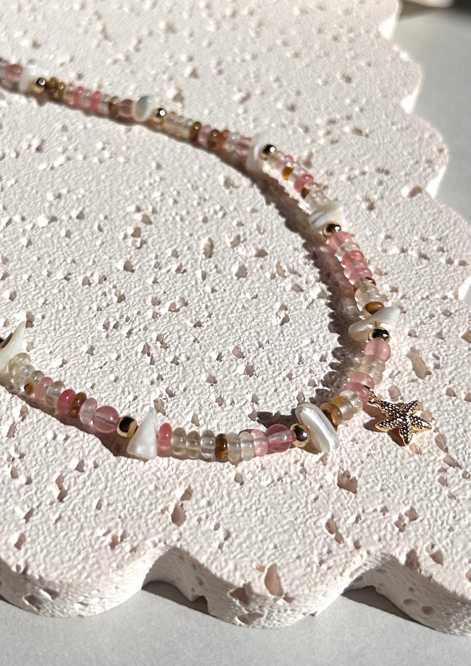 Add a playful touch to your summer look with this hand beaded necklace featuring pink shades of natural stones and starfish charm. Perfect for beach days or adding a touch of whimsy to any outfit.
