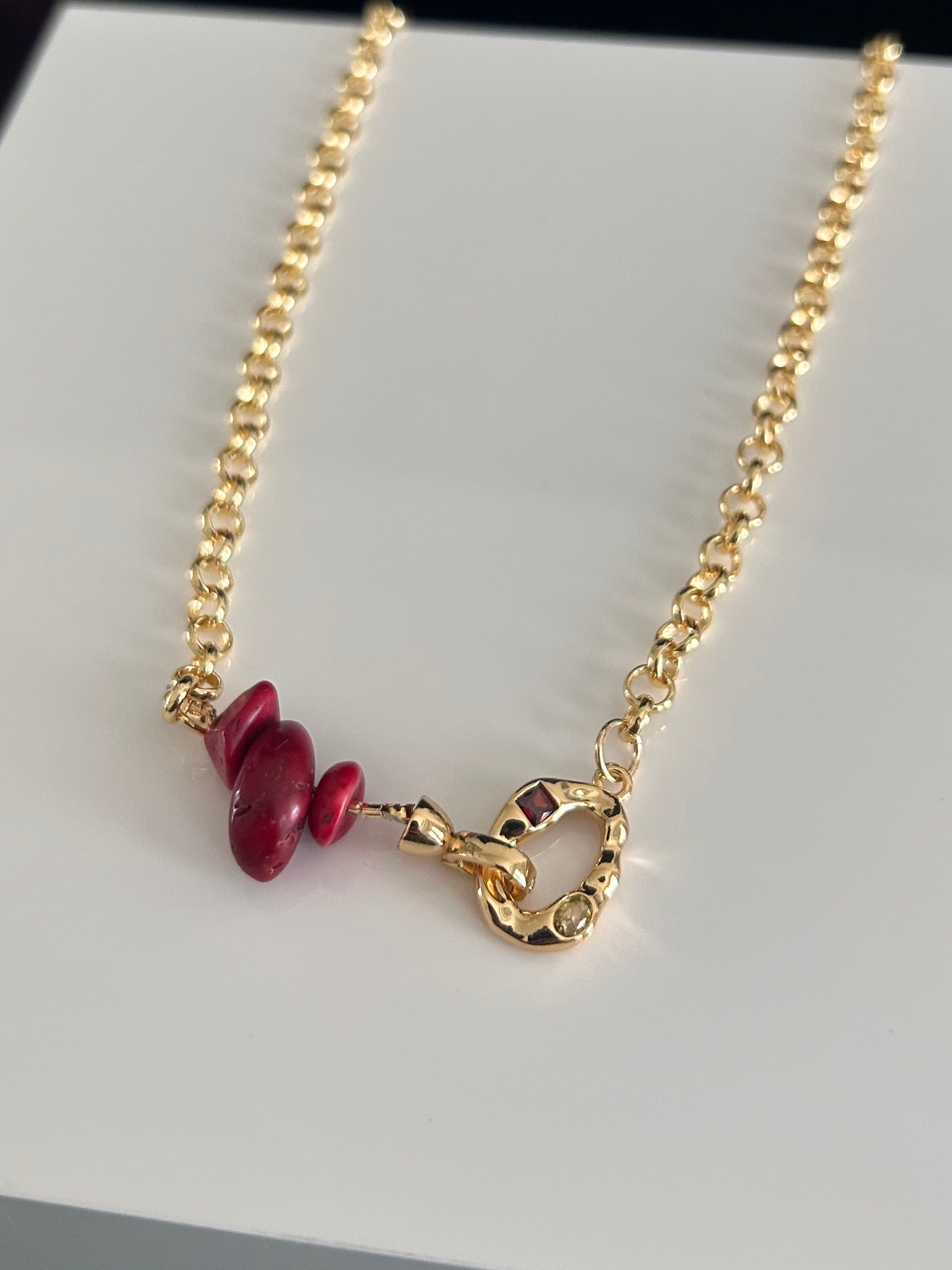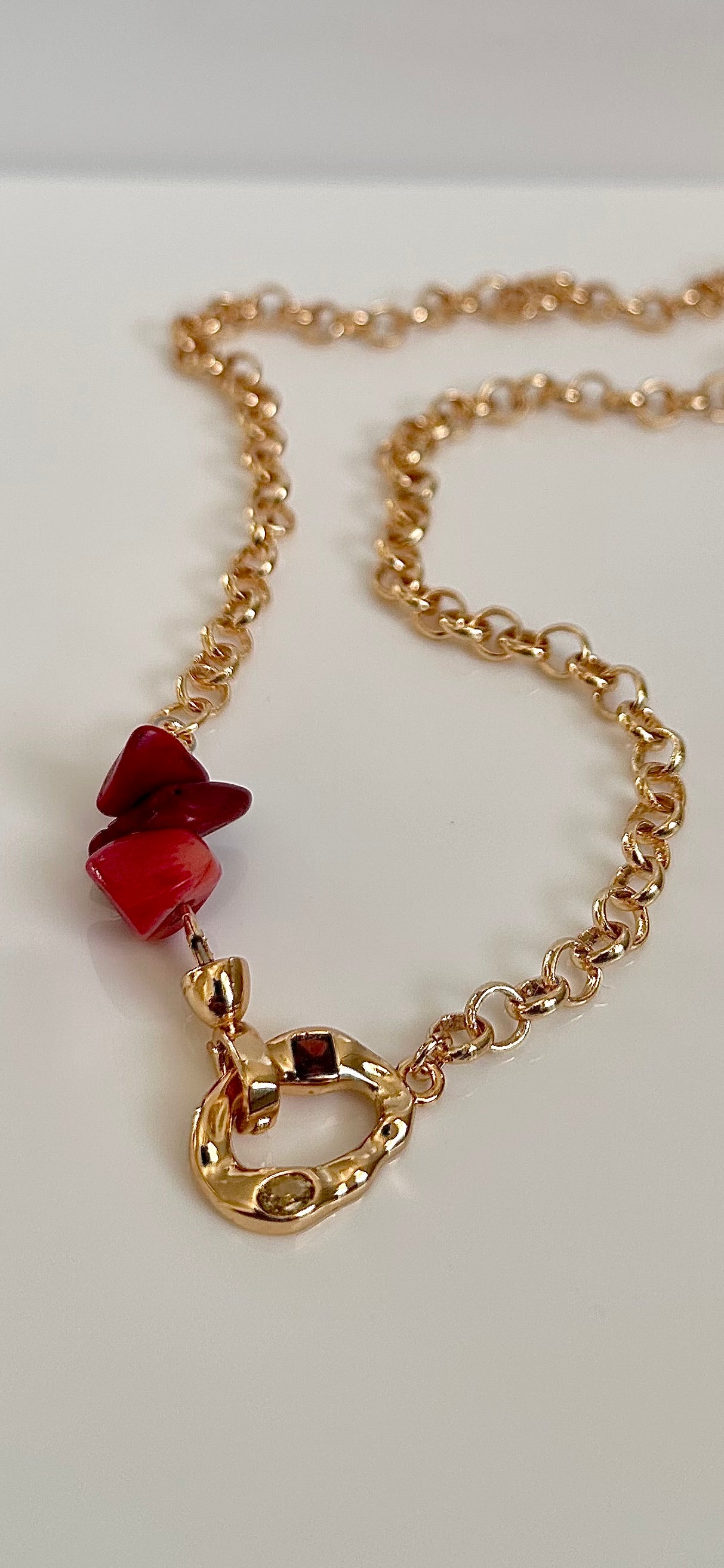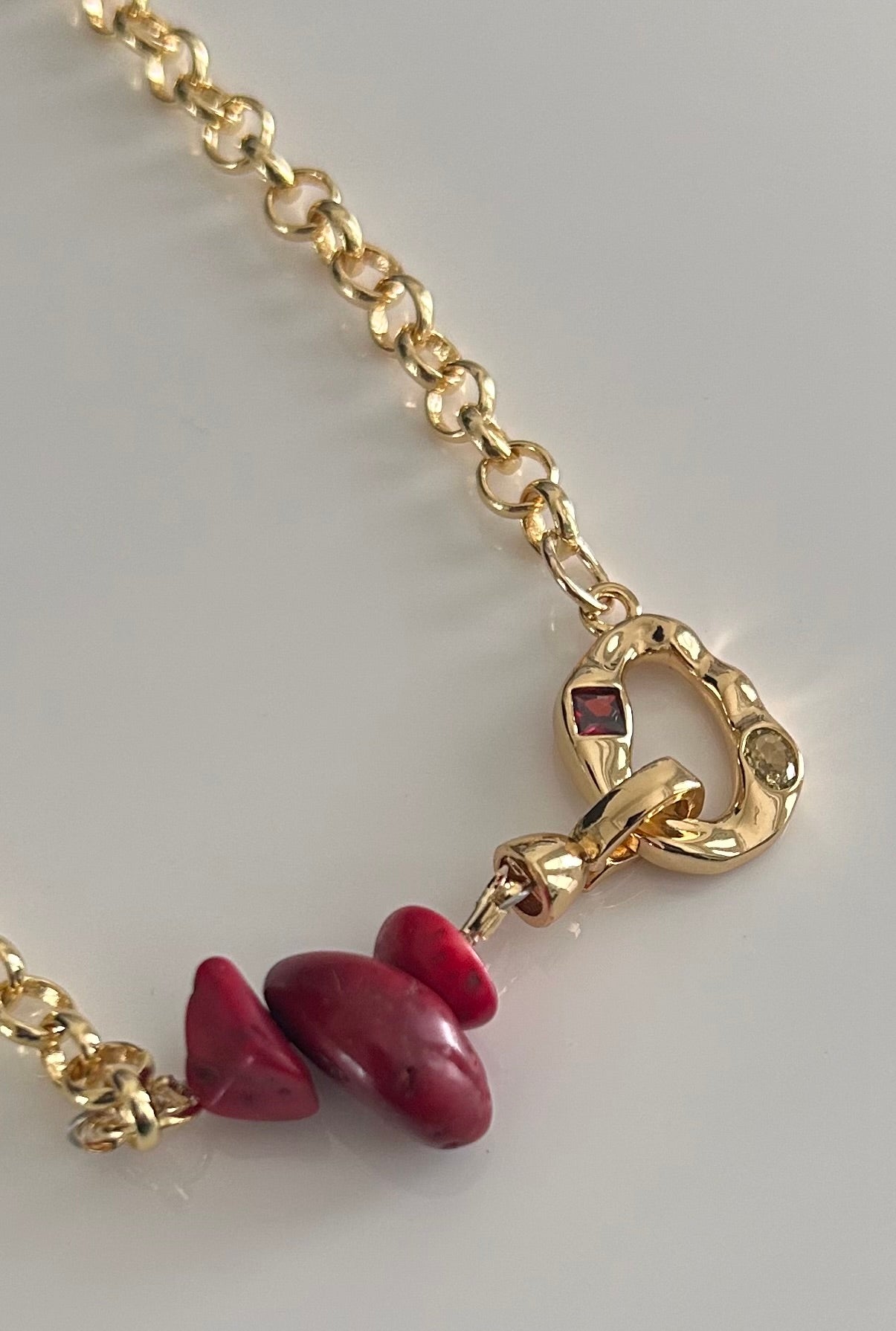 The Eliza necklace features a luxurious gold plated design with stunning red and yellow cubic zirconia accents on the clasp and a striking red stone detail on the chain. Elevate any outfit with this elegant and eye-catching piece.